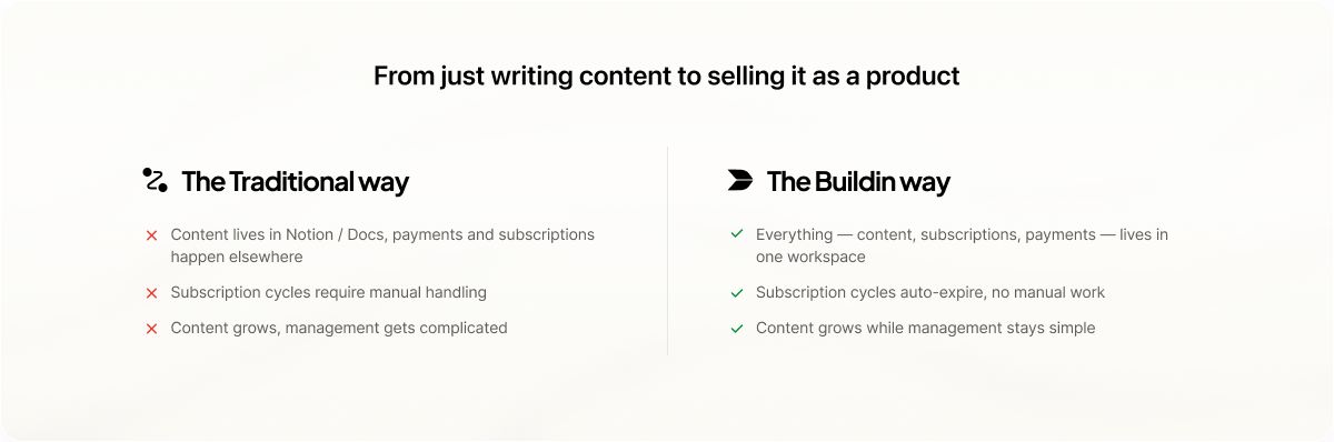Create, organize, and publish in Buildin, then start paid subscriptions instantly.